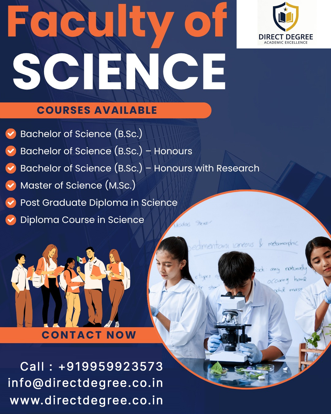 Science courses are academic programs through which students gain knowledge of scientific principles, methodologies, fundamental concepts, and theories related to the natural and scientific world. The field of science encompasses a wide range of subjects, including Physics, Chemistry, Mathematics, Biology, Botany, Zoology, Environmental Science, and Computer Science.
